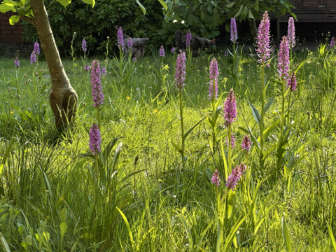 Having previously needing to frequently cut, weed and feed the grass the garden now needs less regular management. The only regular management is to remove willow and birch saplings before they get established. Niall has several tree species adding to the layers of his garden which is important for diverse habitats. The garden boasts a beautiful display of orchids starting at 10 flowering in the first year now reaching over 100 in number! The garden also features an active pond with frogs, dragonflies and newts living in it's watery depths.