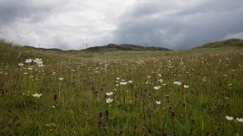 Common flowers (such as red clover, bird’s-foot-trefoil, yarrow and daisies) grow a lot here, along with a few rarer species such as lesser-butterfly orchid, Hebridean spotted orchid, marsh orchid and, on Coll and Barra, Irish lady’s-tresses. Wet hollows hold iris beds, while frequent damp patches support silverweed and ragged-Robin. Some areas are used for farming (e.g. for oats and rye) on rotation, and fallow plots may contain corn marigold, field pansy and poppies. Other areas are used as hay meadows.