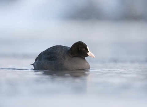 A familiar black bird of our lakes, ponds and rivers, the coot is widespread; look out for its large and untidy-looking nest on the water in spring. The coot can be distinguished from the similar Moorhen by its white beak and 'shield', and its entirely black body.