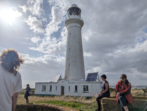 Visitors to Flat Holm Island in front of the lighthouse by Sarah Morgan